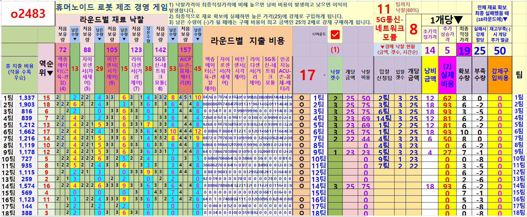 각 로봇 부품을 구매하기 위한 3번의 기회가 주어집니다. 그 안에 해당 부품을 구매하면 됩니다. 그래서 총 18라운드로 진행됩니다. 무조건 로봇을 완성했다고 좋은 것이 아니라 최소 금액으로 로봇 부품을 구입하는 것이 중요합니다. 그러나 최소 금액만 고집하다보면 경매에서 탈락되어 부품을 구입 못하고 마지막에 강제로 최대 금액에 구입하는 경우도 생기니까 잘 판단해야 합니다.
