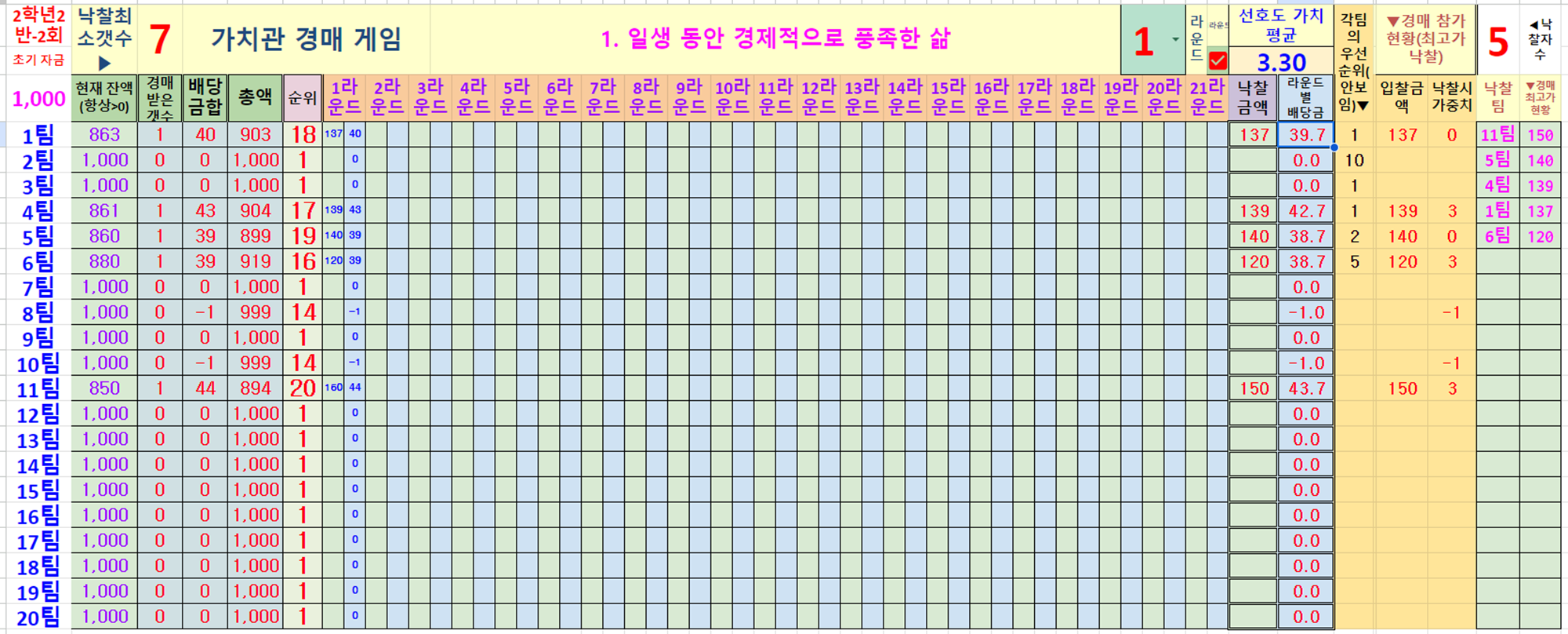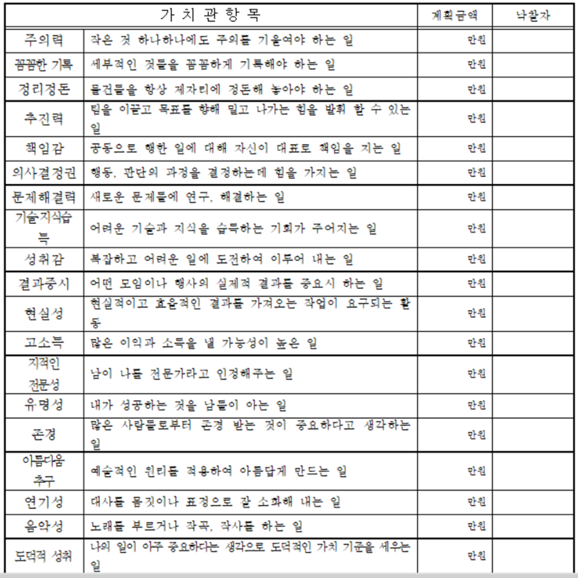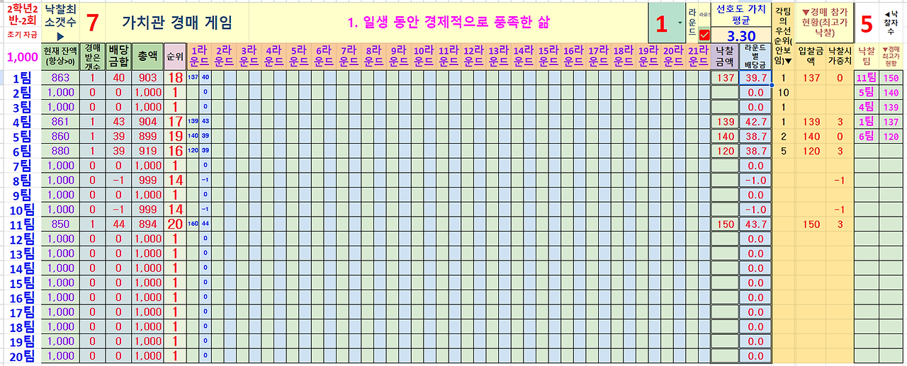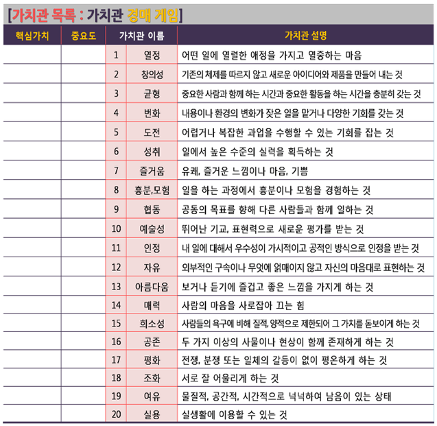 4. 가치관 선호도 조사에서 선택했던 자신의 해당 가치관의 선도호 순위가 높은 것은 최대한 낙찰받도록 해야 유리합니다. 또한 매 가치관마다 선호도(순위)의 평균값이 존재합니다. 평균(순위)가 높은 가치관은 중요하다고 생각되는 가치관이므로 경매로 낙찰받으면 획득 점수가 높습니다.