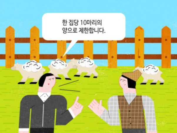 양을 키우는 마을 근처에 주인 없는 목초지가 있다면 목동들은 어떻게 할까요? 그 목초지의 풀이 무한하다면 문제 없지만 양을 풀을 먹는 순간 목초지는 점점 황폐화되어 갑니다. 이 때 목동들간의 더 많은 풀을 자기의 양떼에게 먹이려고 경쟁까지 붙게 되면 목초지가 황폐화되어가는 속도는 더욱 빨라집니다. 개별 목동들의 합리적인 판단과 자유가 전체 공동체의 합리성을 답보하지 못합니다.