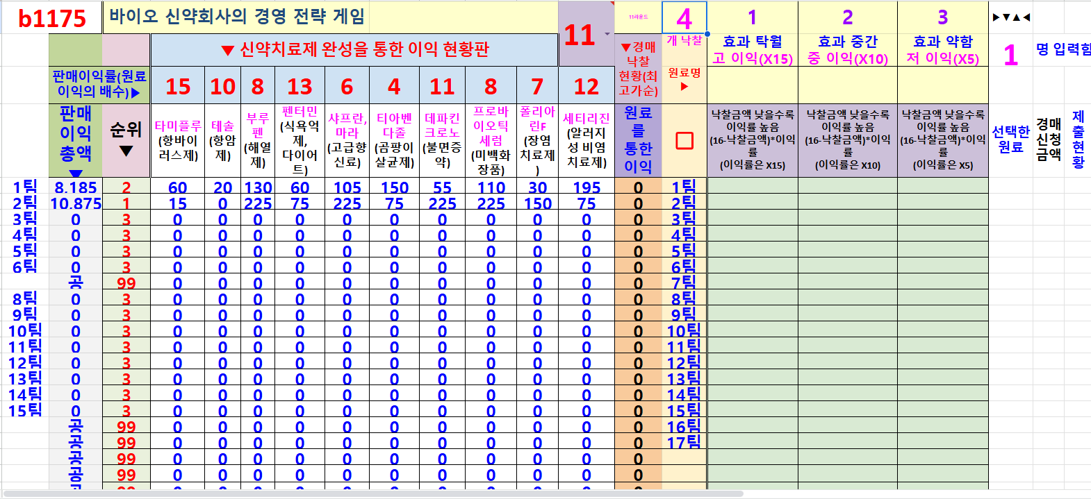 1. 10가지의 바이오 신약이 있습니다. 각 바이오 신약에 필요한 원료식물에는 1번, 2번, 3번의 3가지가 있습니다. 1번 원료식물은 효과가 탁월하여 15배의 이익을 줍니다. 2번 원료 식물은 10배, 3번 원료식물은 5배의 이익을 줍니다.